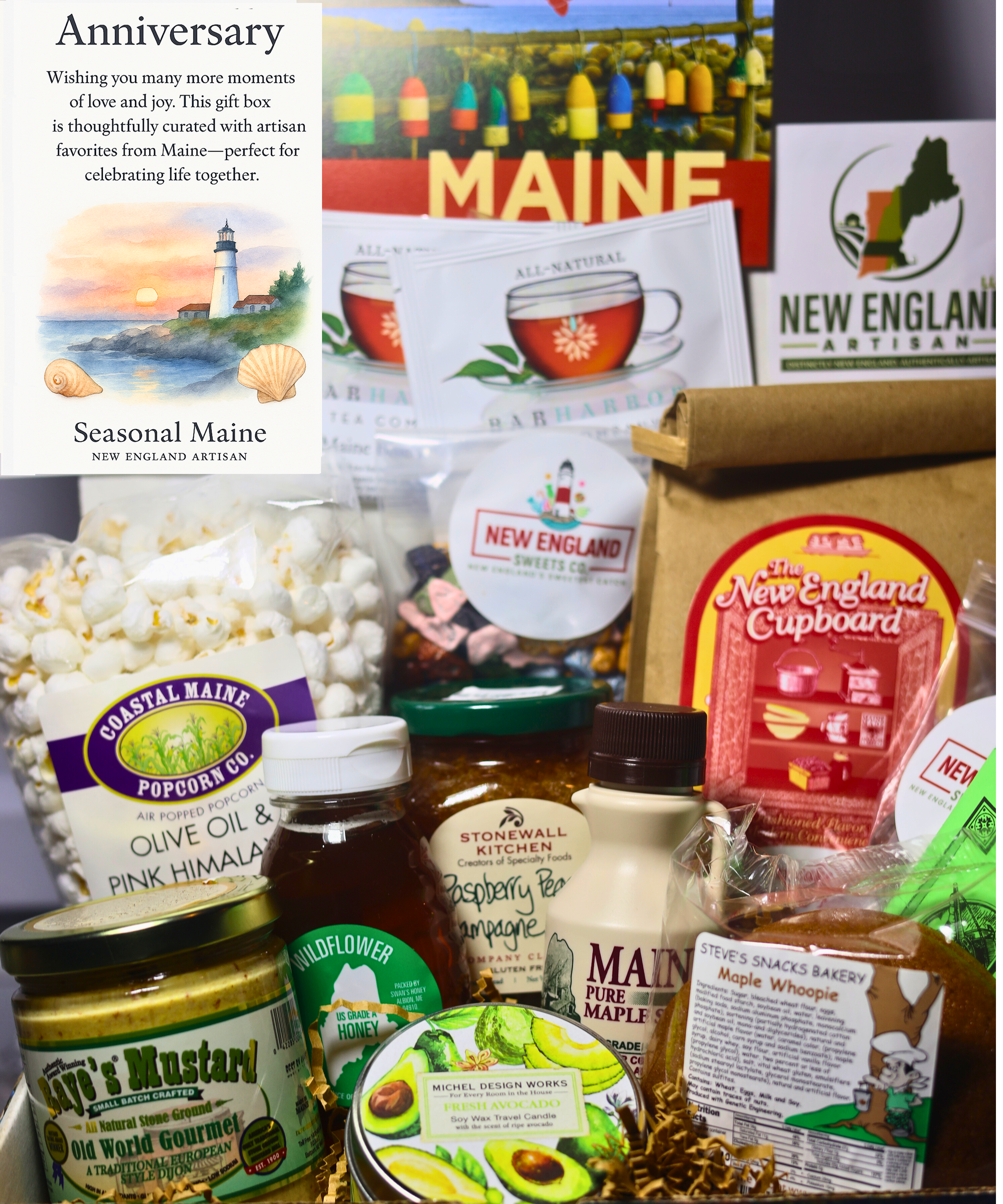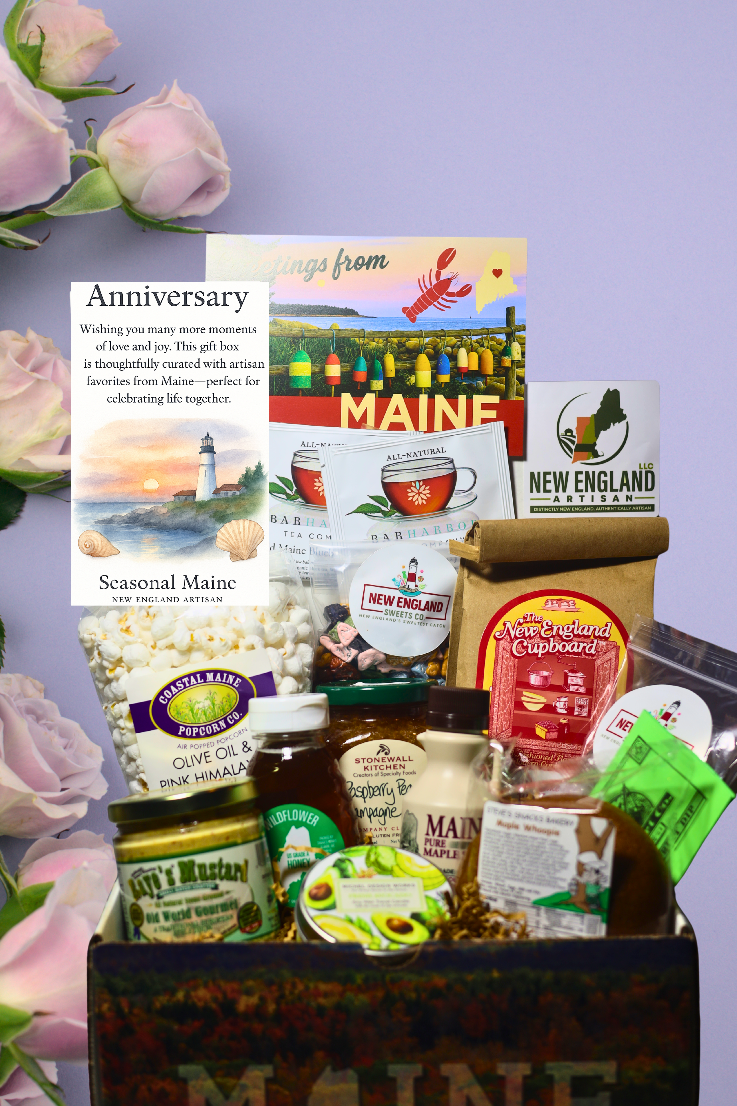 The Anniversary Gift Box - (Premium) (Premium) brings a taste of Maine to any occasion. Packed with a delightful assortment of locally sourced treats, artisan goods, and regional specialties, this box makes a memorable gift for friends, family, or anyone who loves discovering something special.