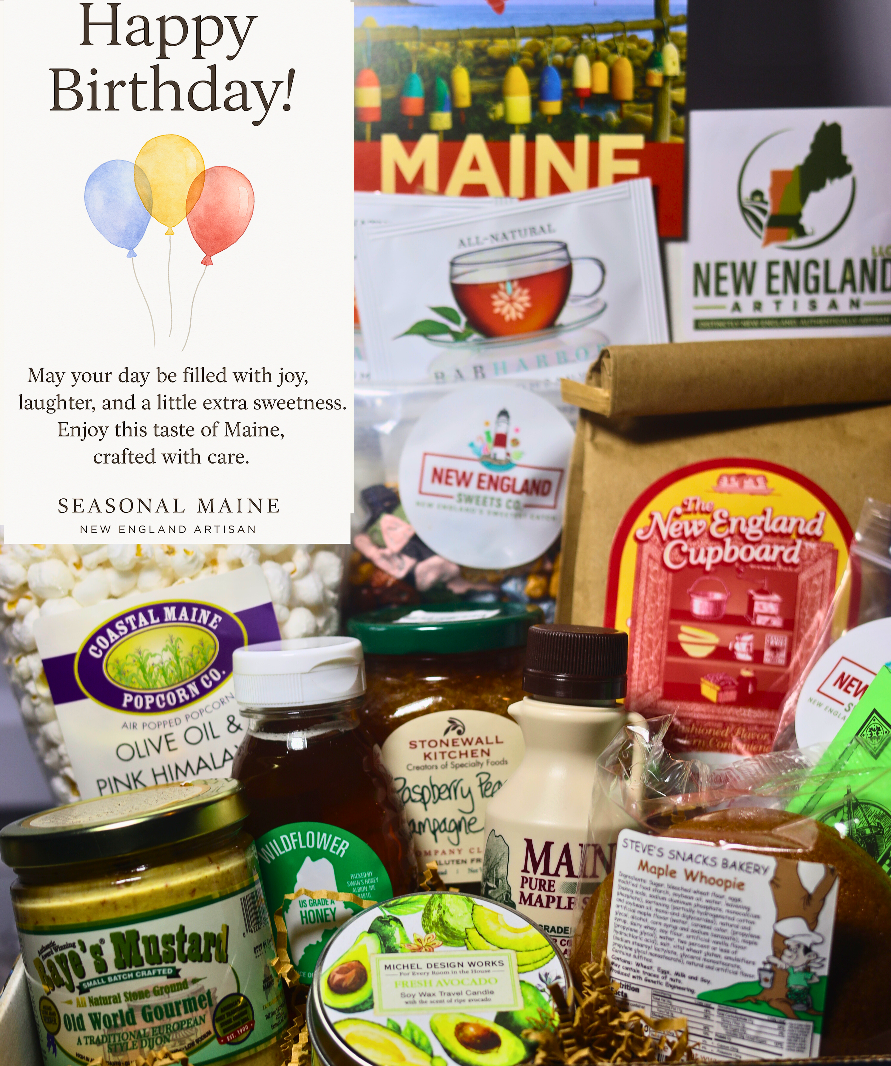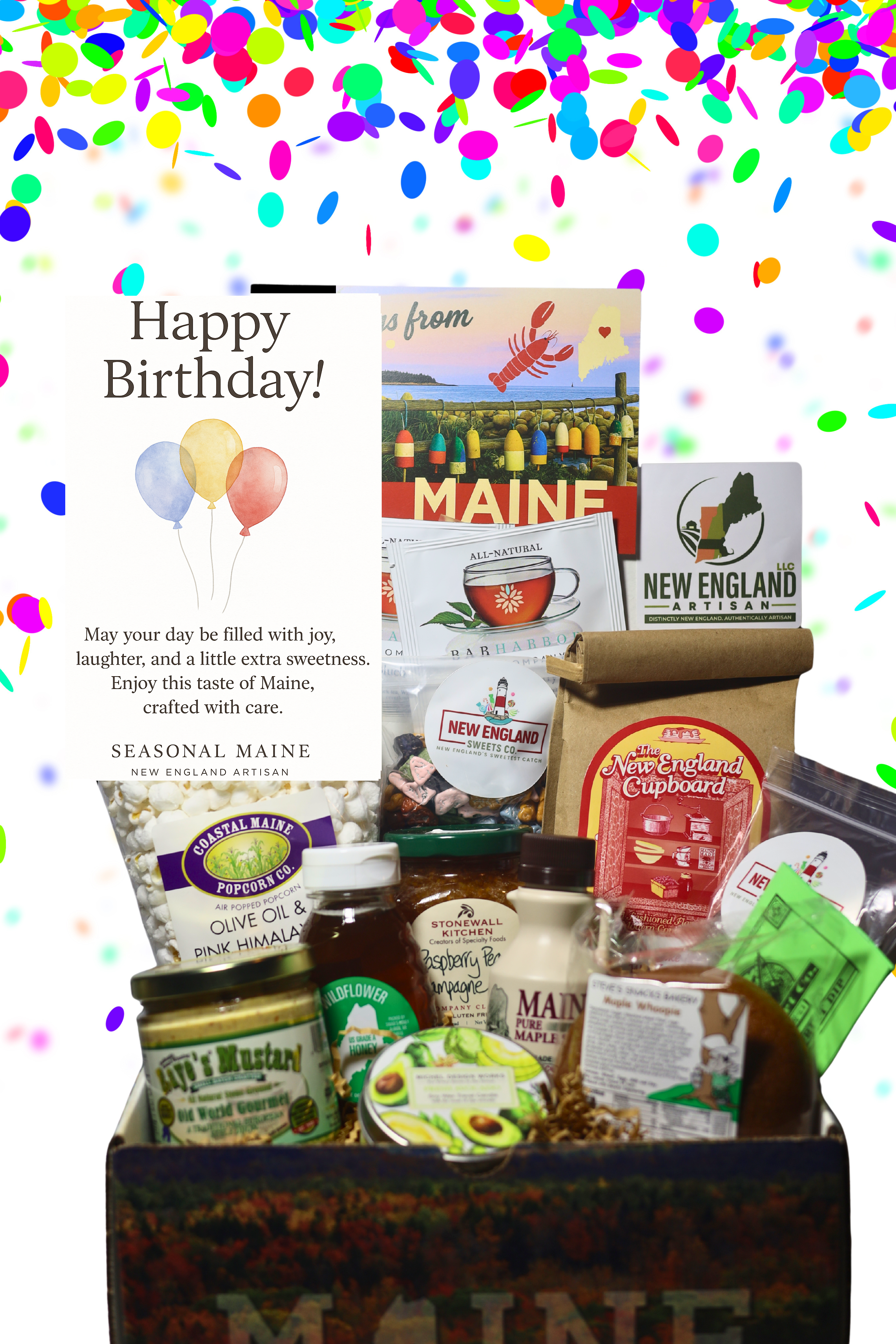 The Birthday Gift Box - (Premium) (Premium) brings a taste of Maine to any occasion. Packed with a delightful assortment of locally sourced treats, artisan goods, and regional specialties, this box makes a memorable gift for friends, family, or anyone who loves discovering something special.