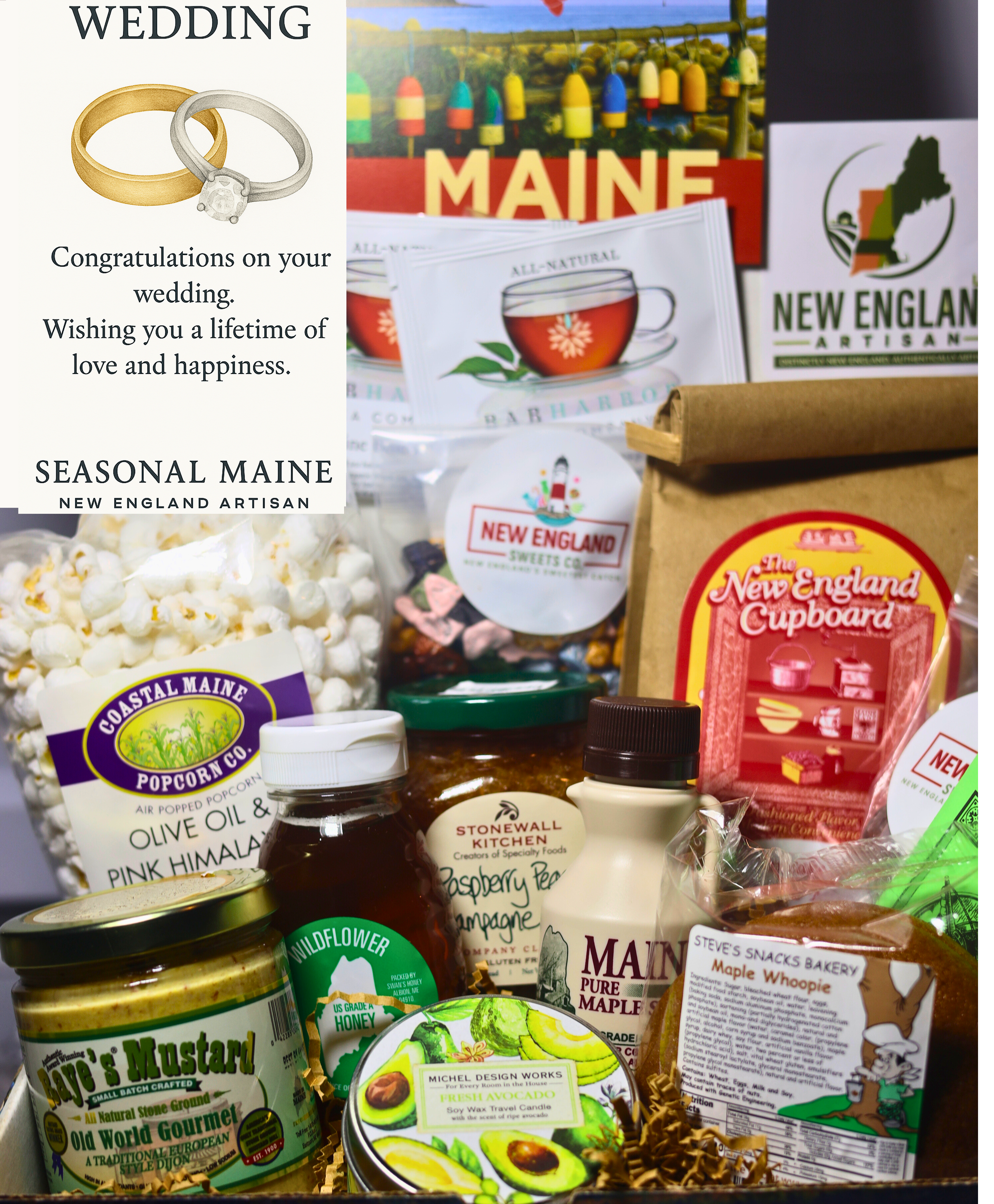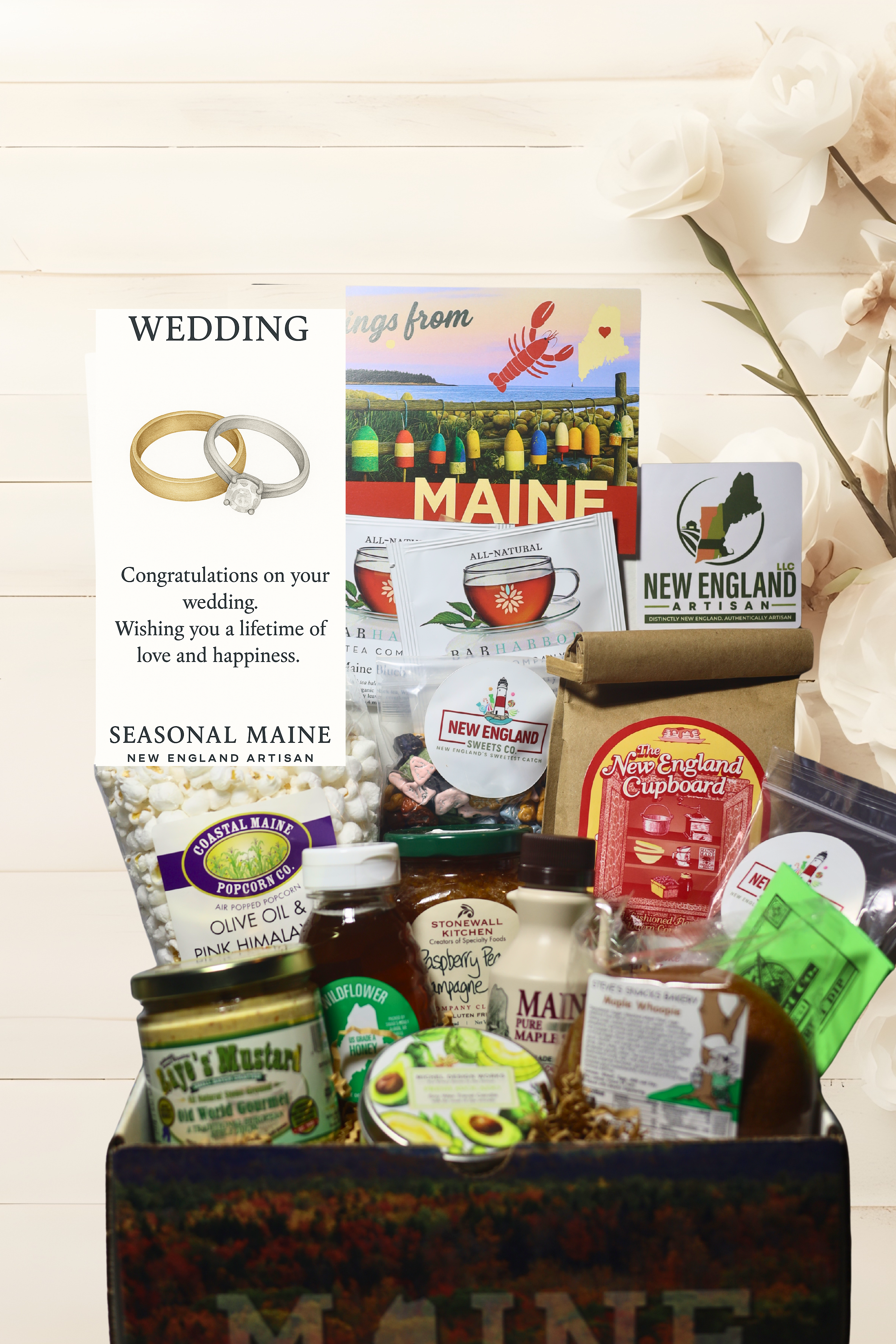 The Wedding Gift Box - (Premium) (Premium) brings a taste of Maine to any occasion. Packed with a delightful assortment of locally sourced treats, artisan goods, and regional specialties, this box makes a memorable gift for friends, family, or anyone who loves discovering something special.